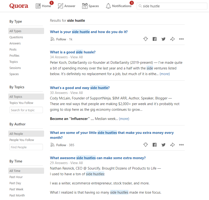 Let’s say you’re writing a post on ‘side hustle’. All you have to do is type the keywords ‘side hustle’ on Quora and you’ll be met with a series of questions people are asking. Pick one that’s got a lot of engagement and create a detailed blog post on it.